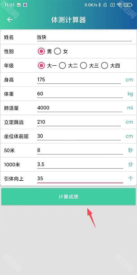 3、输入相关信息,如姓名、性别、年级、身高、体重等,点击计算成绩。