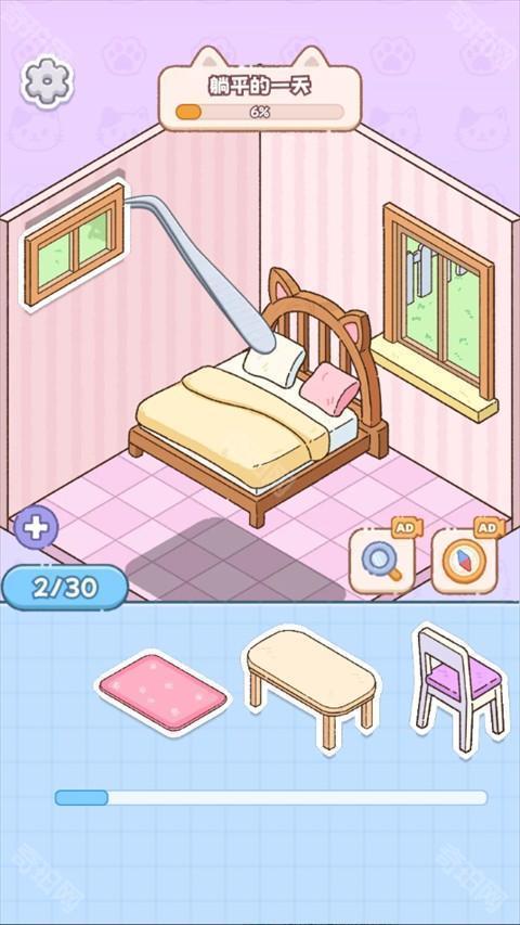 3、完成之后点击领取奖励,解锁下一个房间,继续为小猫咪打扫和归纳。