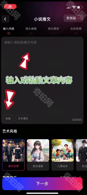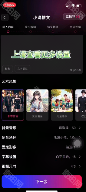 4、上滑设置艺术风格、背景音乐、配乐角色等,完成设置后点击下一步。