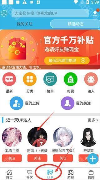 1、首先在当快站下载安装好软件,进入到主页面选择“up”功能按钮,然后点击进去找到达人排行,选择如图所示的达人。