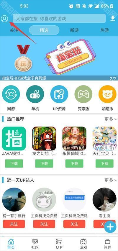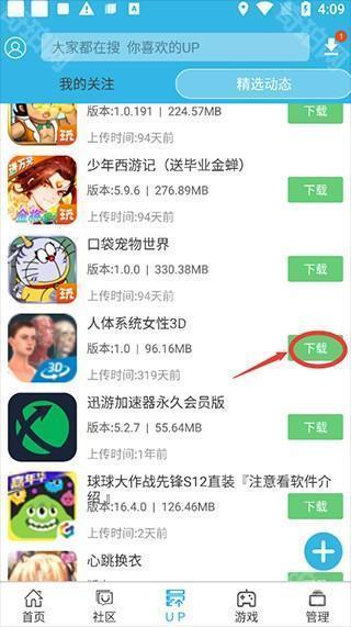 4、如果是想要找到自己想要开挂游戏的应用的话,那必须也是点击“up”功能按钮;