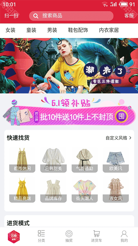 5、用户可在首页或者分类进行选购,遇到喜欢的服装可一键加入进货车。