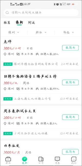 5、用户也可以在首页进行搜索或者是筛选职位/企业,遇到自己喜欢的直接投递简历即可在线与hr沟通。