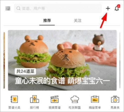 2、接下来在首页右上角点击“+”选项,就可以从出现的功能列表里选择“上传菜谱”功能,从而上传自己的特色菜谱。