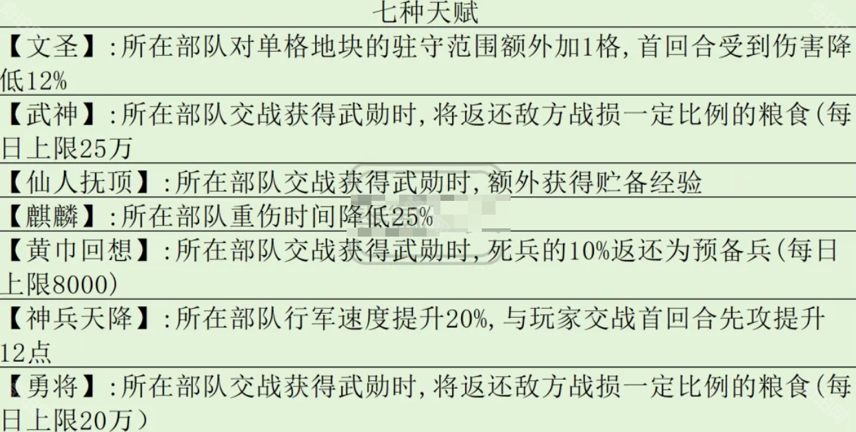 天赋效果:交战获得武勋后,返还敌方战损一定比例的粮食,每日上限xx万