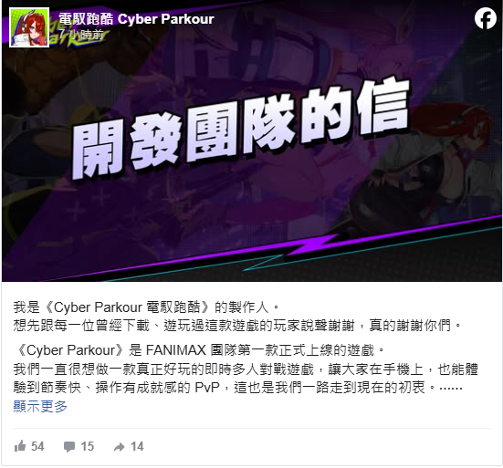 本作的制作人今日透过社群平台公开「开发团队的信」,于信中回忆了开发《电驭跑酷 Cyber Parkour》的初衷,以及营运游戏的点点滴滴,同时也解释了决定停止营运的原因:「营运几个月下来,实际的营收表现与原先预期有不小的落差,而团队、人力、伺服器与相关套件的营运成本,也让我们无法再支撑长期开发与营运。经过非常多讨论与挣扎,我们最后还是必须做出停止营运的决定。」