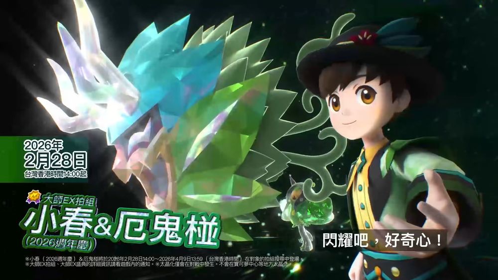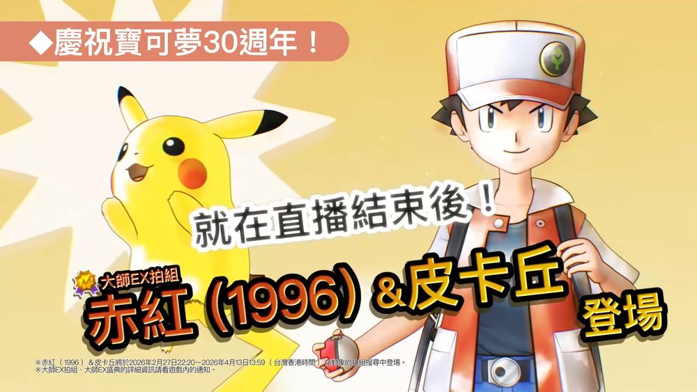 今日的「Pokémon Presents 2026.2.27」直播结束后,纪念《宝可梦》30 周年的大师 EX 拍组「赤红(1996)&皮卡丘」在《宝可梦大师 EX》中登场。除此之外,纪念《宝可梦大师 EX》6.5 周年的大师 EX 拍组「小春(2026 周年庆)&厄鬼椪」与「小青(2026 周年庆)&太乐巴戈斯」也分别将于 2 月 28 日(五)、3 月 2 日(一)登场。