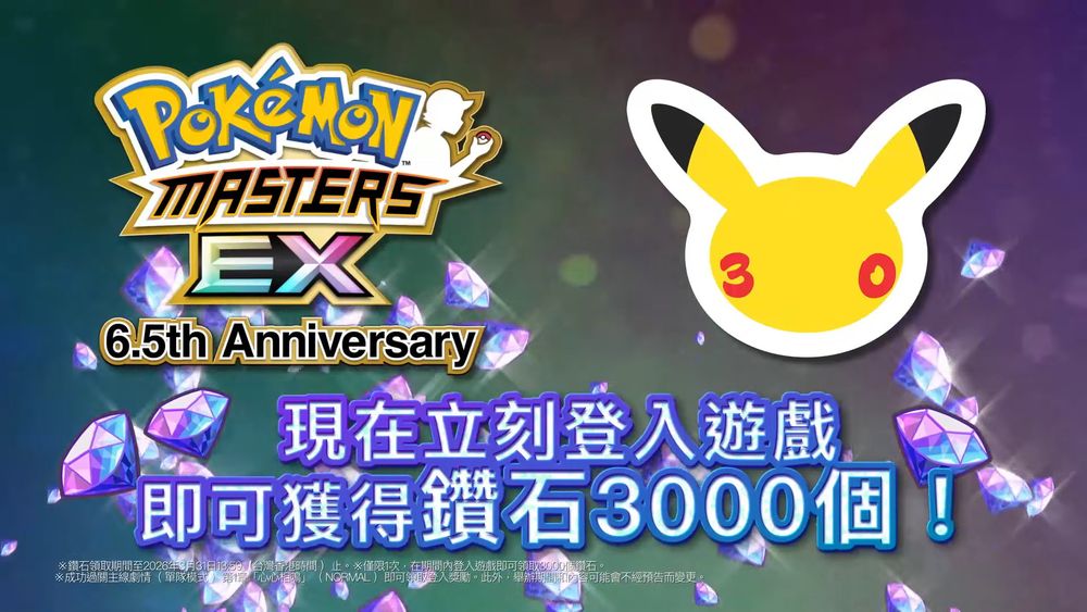 不仅如此,为纪念《宝可梦》30 周年与《宝可梦大师 EX》6.5 周年,即日起登入《宝可梦大师 EX》即可获得钻石 3000 个。