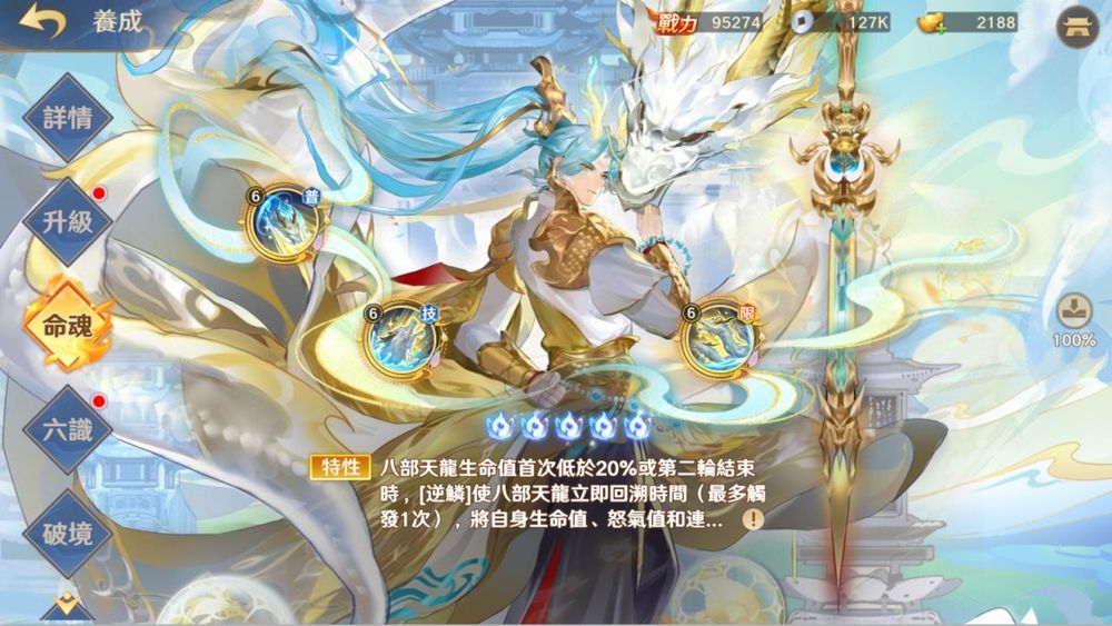 作为首位神魔 LR 神将,其最大的特别之处,便是拥有额外的强力限定技能。八部天龙主要依靠[逆鳞]和 [龙威]这两种机制进行战斗。[龙威]能使携带者降低攻击、防御和最大生命值,而[逆鳞]在累计获得 10 层时,便能立即释放 1 次限定技,对敌人造成物理伤害,并有机率无视目标闪避、格挡和免疫。