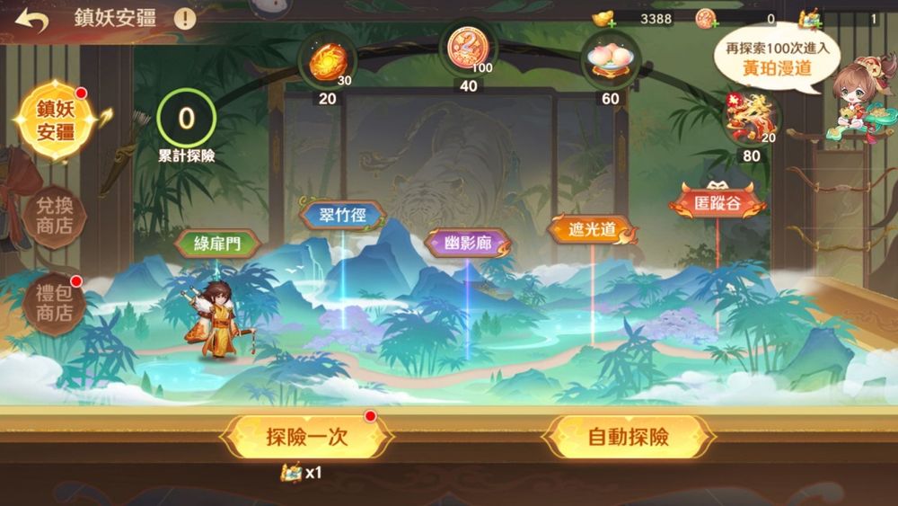 玩家可使用活动道具「镇妖图」进行探险镇妖,达到一定次数后可获得道具奖励,累积探险次数还能逐步解锁兑换商店等级,使用镇妖获得的活动道具「双辰金器」,便可在商店中兑换神魂六选一、LR 神将碎片四选一、剧场礼花、典藏玩偶任选等道具奖励。