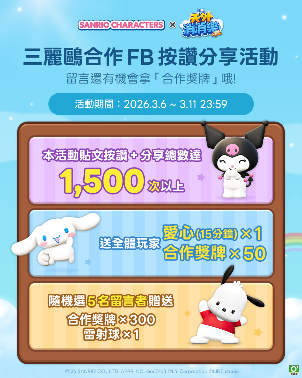 为了庆祝本次合作,「LINE GAME Taiwan Facebook 官方粉丝团」将举办贴文按赞分享留言活动,送上纪念好礼,帮助玩家通关更加顺利!活动期间内,只要于「LINE GAME Taiwan Facebook 官方粉丝团」指定贴文的按赞+分享次数总计达 1,500 次以上,全体玩家将获得「爱心(15 分钟)」及「合作奖牌 x50」的特别奖励!若玩家参与「公开分享贴文」并于贴文下方「留言写下你最喜欢的三丽鸥明星家族角色」,还有机会再获得「合作奖牌 x300」以及「雷射球 x1」的幸运奖励!把握机会快来参加吧!