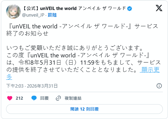 由集英社游戏与网易游戏联手开发的智慧型手机专用 RPG《unVEIL the world》,官方于今日宣布游戏已决定在 2026 年 5 月 31 日(日)终止提供服务。同时,即日起也停止玩家申请新帐号及购买伊甸光晶。