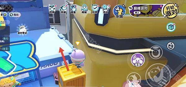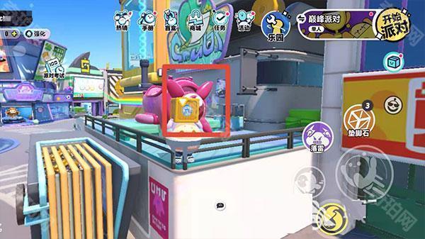 首先我们要拿到踮脚箱道具,如果暂时找不到也没关系,四处找一找道具刷新,很容易就能拿到。拿到道具后,来到盲盒商店与旁边蓝色商店的角落,一块一块垒起来,之后跳到蓝色商店的顶部平台,从平台上跳到房子后方,从这里开始,后面就全都是未开发区域了。