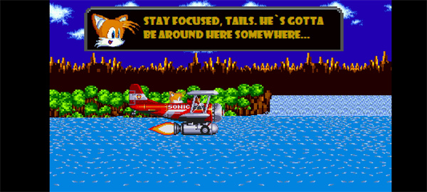 然后画面显示,恶魔化的塔尔斯 (Tails) 驾驶着龙卷风 (Tornado),上面有埃克塞蒂奥 (Exetior) 和纳克尔斯 (Knuckles),埃克塞蒂奥 (Exetior) 说道:“姑娘们准备好!我们出发了!”