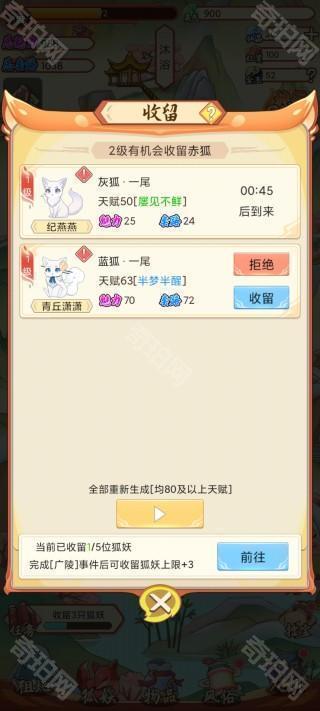 在收留界面可以收留其他玩家赠送或者系统随机生成的狐妖,他们的天赋是随机的,看广告可以生成80及以上天赋的狐妖。