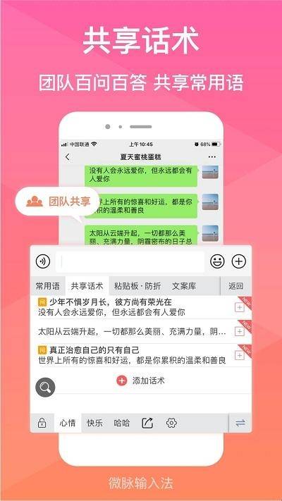 微脉输入法是一款好用的输入法工具软件。应用提供五笔、九键、26键、笔画和手写等多种输入方式,满足您不同的打字偏好。软件提供共享话术、表情连发、特殊字符和特殊字体等多种功能,带给您丰富多彩的使用体验。在这里您可以完全自定义您的个性化词库,软件将根据您的输入习惯来智能匹配词语,采用了智能输入技术,从而提高您的输入效率。想要体验的小伙伴快来本站下载试试吧。
