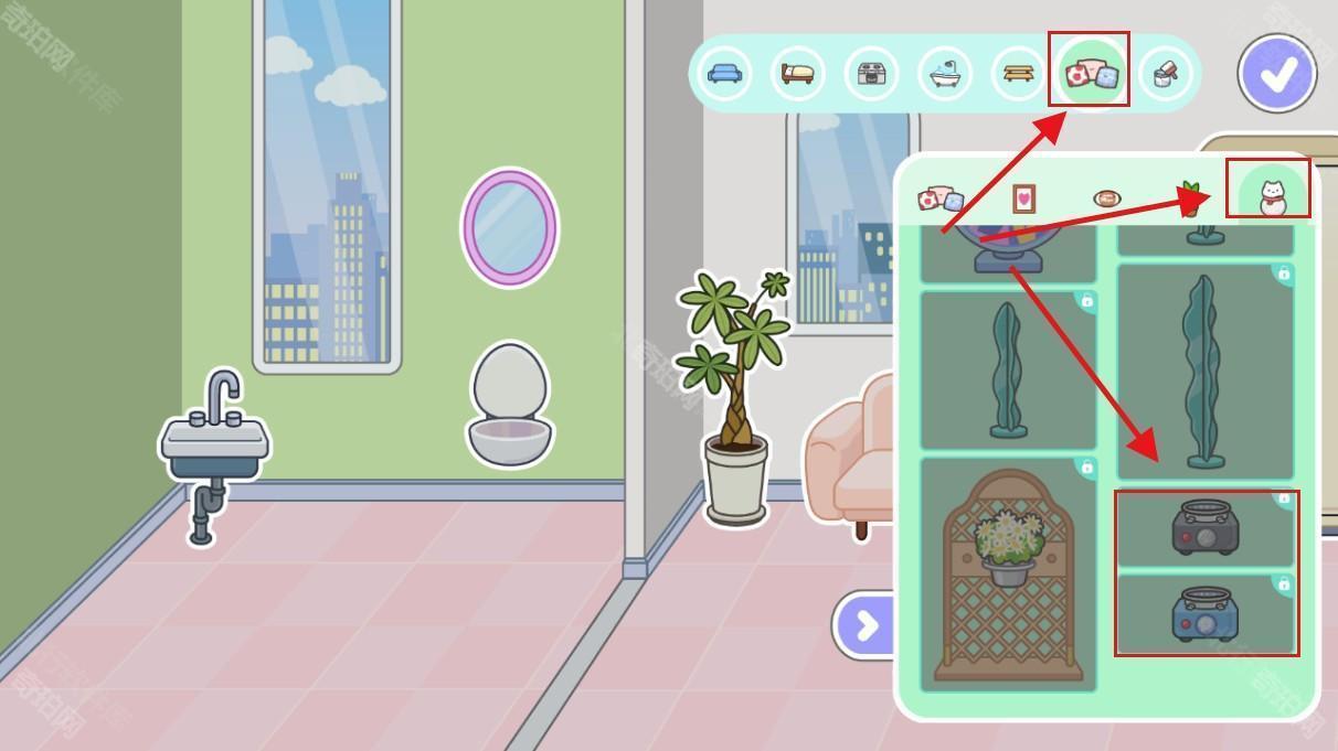 2、看到右侧弹出的家具菜单,依次点击【枕头】→【雪人】,拉到最下面,可以看到两个【装置】