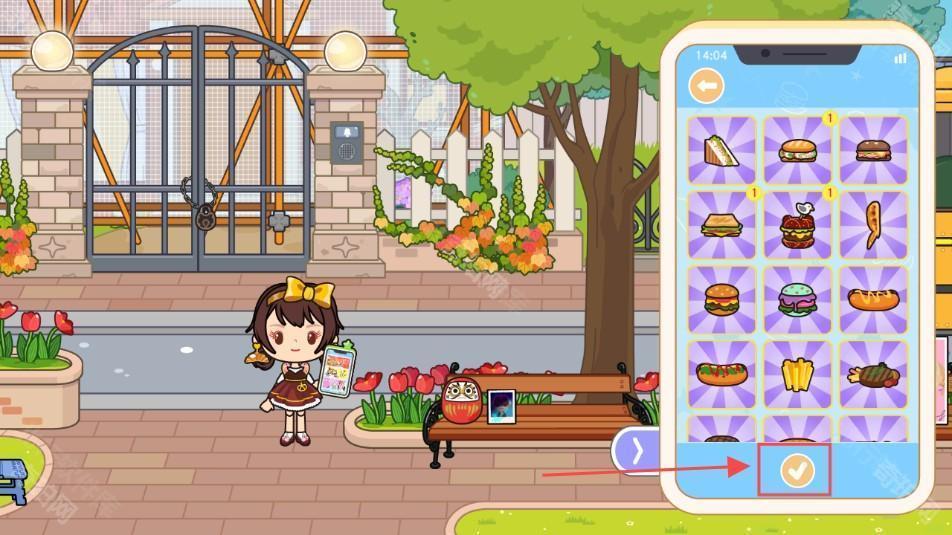 3、在操作界面中选择你想要吃的外卖,购买后点击下方的√,外卖即可开始配送