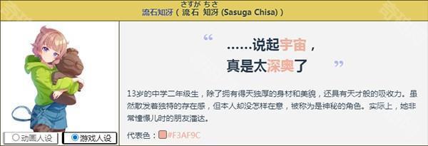 13岁的中学二年级生,作为天狼星年轻王牌而迅速走红,是个开朗、有魅力的气氛制造者。