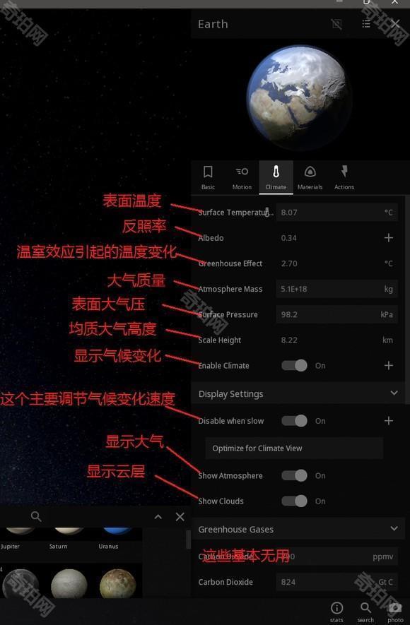 似地球的岩质行星才有的,其他行星则是Temperature选项,恒星则没有这个选项,在这里可以调节星体温度,气压,大气质量等,也可以开关气候变化(Enable Climate)由于不同种类星体的选项都不尽相同