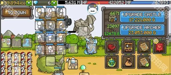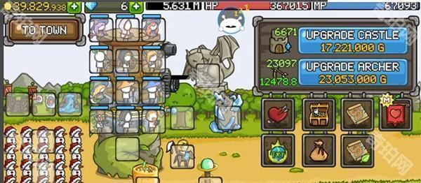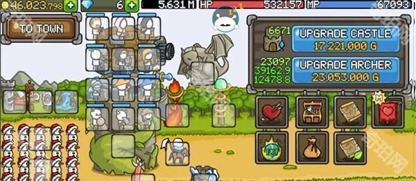 1、进入成长城堡游戏后,可以升级城堡和升级普通弓箭手来提升战力。