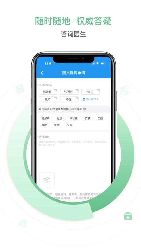 4、患者可在线选择所需医生、足不出户发起图文咨询、电话咨询,随时随地获得专业医疗建议。