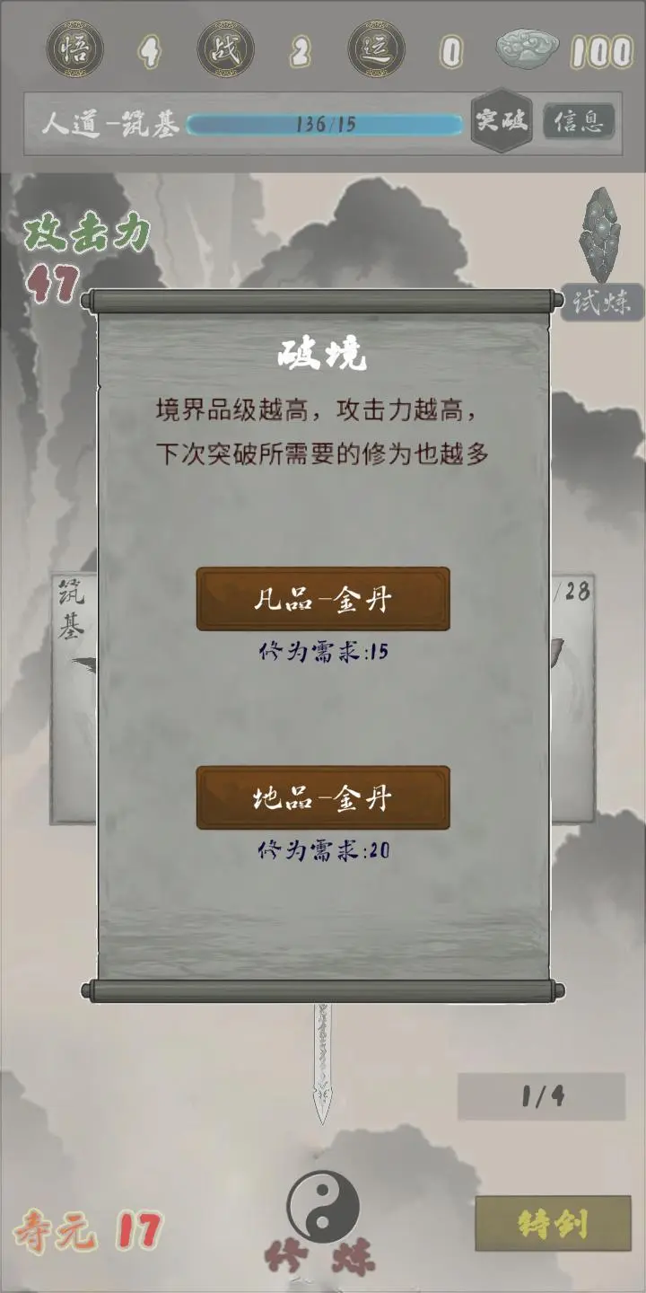 3、运用已掌握的剑招与心法,在即时战斗中灵活组合技能以应对强大敌人,并挑战各种“心境试炼”与“外劫”,克服瓶颈以实现境界突破,获得质的飞跃。