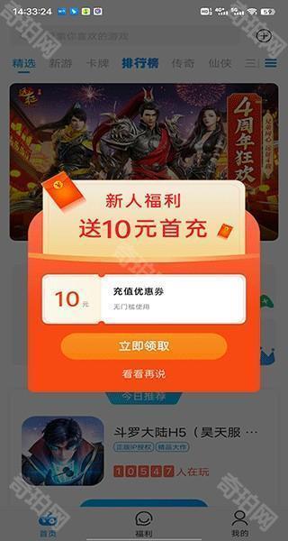 1、在本站下载好比折玩app后,打开软件,新用户登录就送10元无门槛充值优惠券。