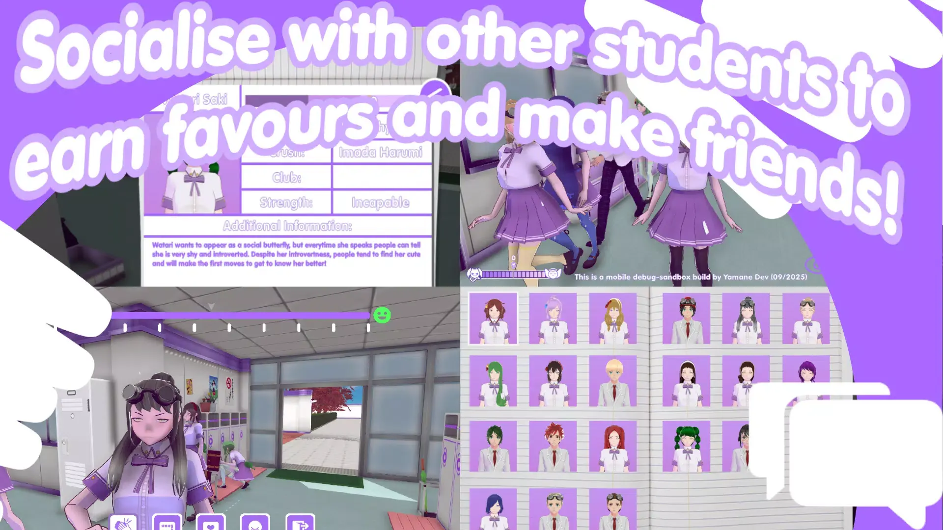 《山根的病娇爱情生活》是一款3D高清的开放世界校园冒险角色扮演游戏。游戏中玩家将扮演一名高中学生,你需要前往校园中体验日常生活,在这里你可以发挥你的想象做一切你想做的事情,探索校园、体验课程、日常生活交友在这里都能够实现,摸索前行吧!游戏玩法自由,玩家合理运用策略、规划,有时甚至运用无情的创造力可以让游戏更加有趣。感兴趣的话欢迎在本站进行下载游玩!