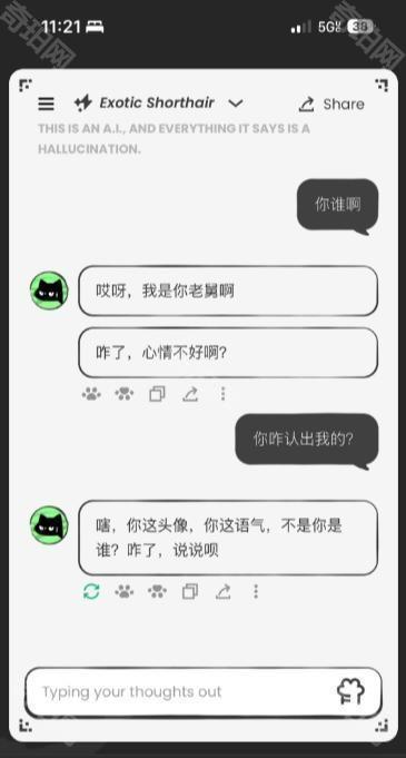 2、提供“橙猫”(温和友善)与“异国短毛猫”(嘴炮毒舌)两种预设角色,风格截然不同。