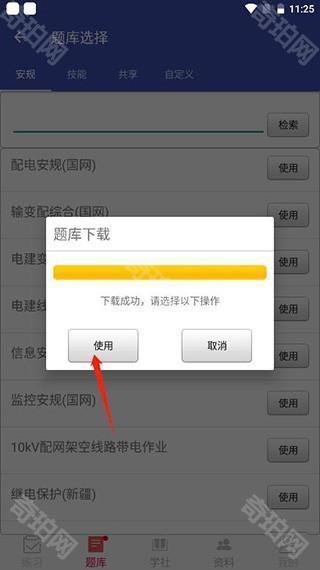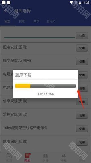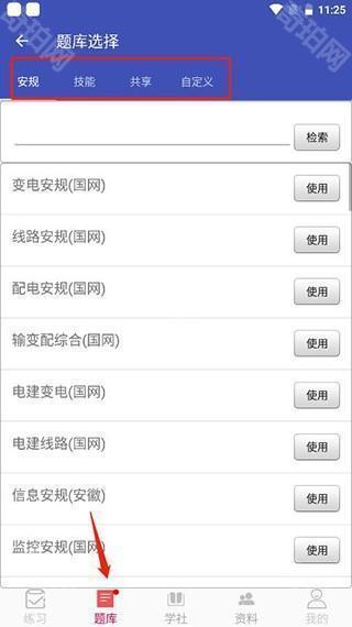 1、点击题库,这里带来了安规、技能、共享、自定义等分类,里面有各种题库。