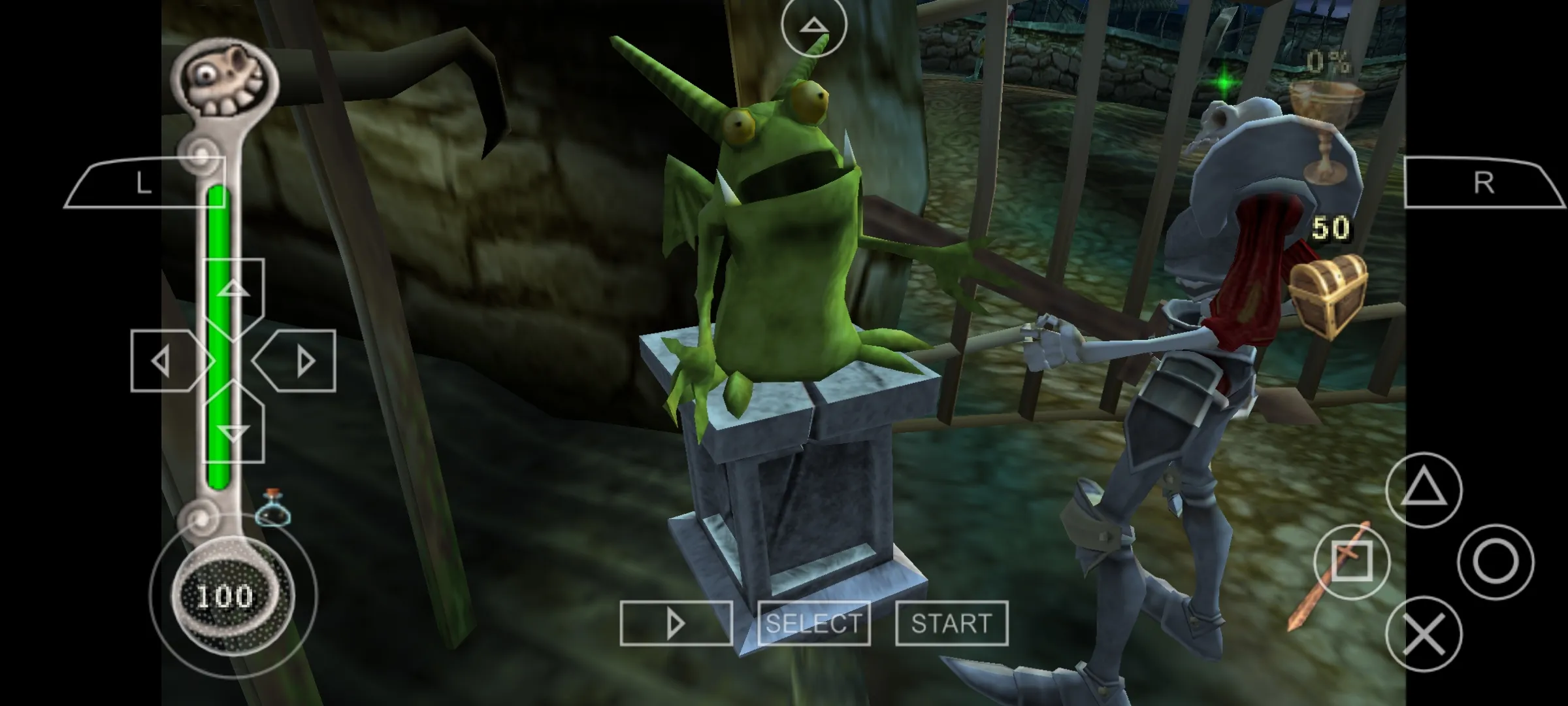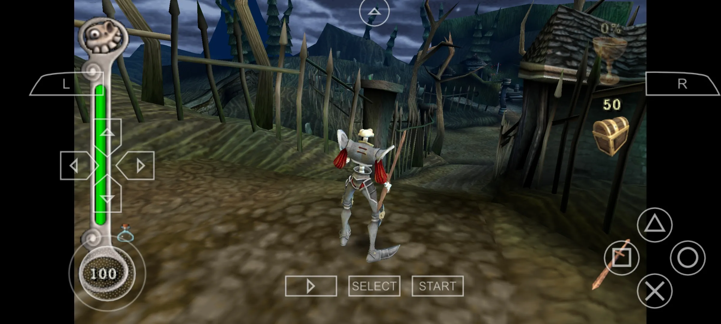 清光路上杂兵来到叉路口(一边是一座桥,另一边是一条小路),清光小路上的杂兵来到圆形石块处在其旁边有一个坟墓用木棒击碎石块清光杂兵,打开宝箱获得木盾进入旁边的洞穴。洞穴中间是恢复点。洞中有一个书架打碎书架出现机关,击打机关书架左边的铁门打开,进去后发现中间有一圆锥形的石台,出来进入进书架右边的门,中间也有一类似的石台,但是石台上冒着火用木棒击打石台,发现木棒被引着出来进入左边的门,用引着的木棒击打并可以点燃中间的圆锥石台,所有的门开启清光杂兵,获得蓝色石板和铁锹,上楼在左边取得女巫的法宝(Witches Talisman)。然后跳下来到门口的坟墓前使用铁锹(spade)获得100G,来到桥清光桥上和前方所有杂兵,过桥打开右边的宝箱获得木棒,打开左边宝箱会出现一条闪电(动作快的玩家打开后马上跑开可以躲开,动作满的玩家建议不要去开)用蓝色石板打开铁门清光杂兵左边有一商店玩家可以在此补充一下。清光路上和树林中的杂兵,沿着河穿过树林可以获得补血药剂和chalice(酒杯)转身出树林清掉路上和桥上的杂兵。来到滚石山区,山上不段有圆形巨石滚下巨石分两种:第一种和平时的挡路巨石一样可以用木棒击碎,滚下时如遇到山腰中间的楼梯会从楼梯上滚下。第二种颜色是石灰色并绑有铁链无法用木棒击碎滚下路线是沿正个山体(玩家可以利用地形来巧妙地躲避见图),玩家的任务就是用木棒击碎第一种巨石,躲避第二种巨石并顺利到达山顶(如没把握的玩家建议过滚石山区的时候先存档)到达山顶发现教堂,在教堂的右面有恢复点,进入教堂本关结束。