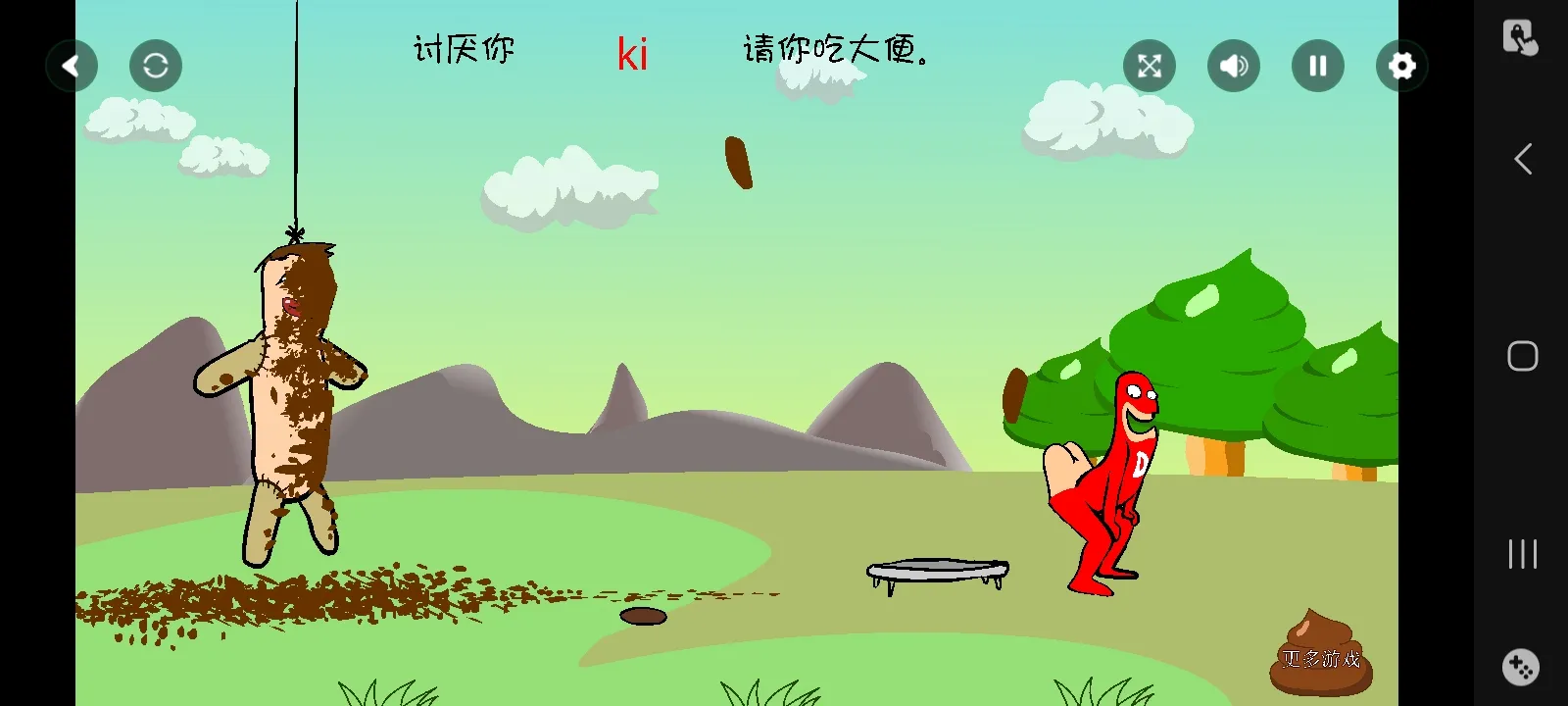 《大便超人2》是一款非常恶搞的休闲小游戏,该游戏由PC端移植而来,并采用动画卡通画风绘制,玩家在游戏中将化身为一名大便超人,它以大便为武器,你可以在左侧人偶上写上自己讨厌的人的名字,然后点击右侧11个按钮,然后大便超人就会以不同的招式攻击人偶,如飞天、旋转、大便手雷等。