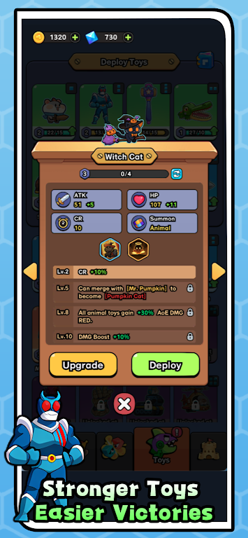 3、升级系统,通过战斗获取资源,升级玩具,解锁新技能,增强团队实力。