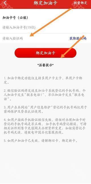 3、输入加油卡号和验证码,点击绑定加油卡。