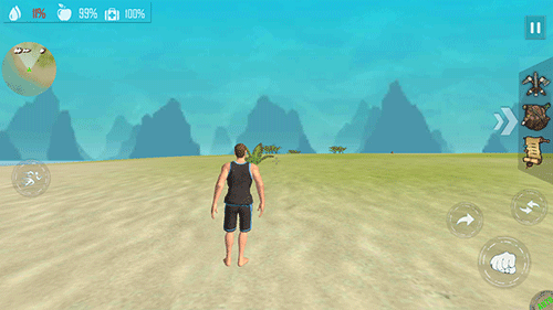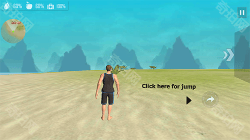 2、上岛之后,点击左右两侧对男人进行移动,先给它补充一点体力,再根据地图上食物的位置,去荒岛上采摘椰野果。