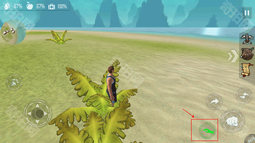 3、接着,男人吃完食物之后,接着又在荒岛上采摘椰子,你需要走近靠近椰子的时候点击“手”的图标,就能采摘了。