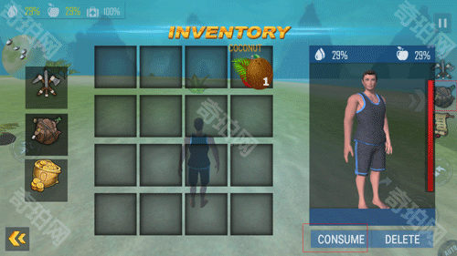 4、注意,你需要关注男人的体力值,通过屏幕左上角可以看到当前体力,体力不够,就点击右侧的背包选择食物,点击“consume”,即可补充体力啦,不吃东西就会晕倒哦。接下来就看你们啦!