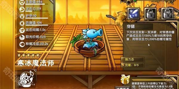 技能(穿透):下次攻击发射冰棱,对穿透僵尸造成 130% 攻击 + 10 穿透伤害,附带 200% 攻击的寒冷属性。