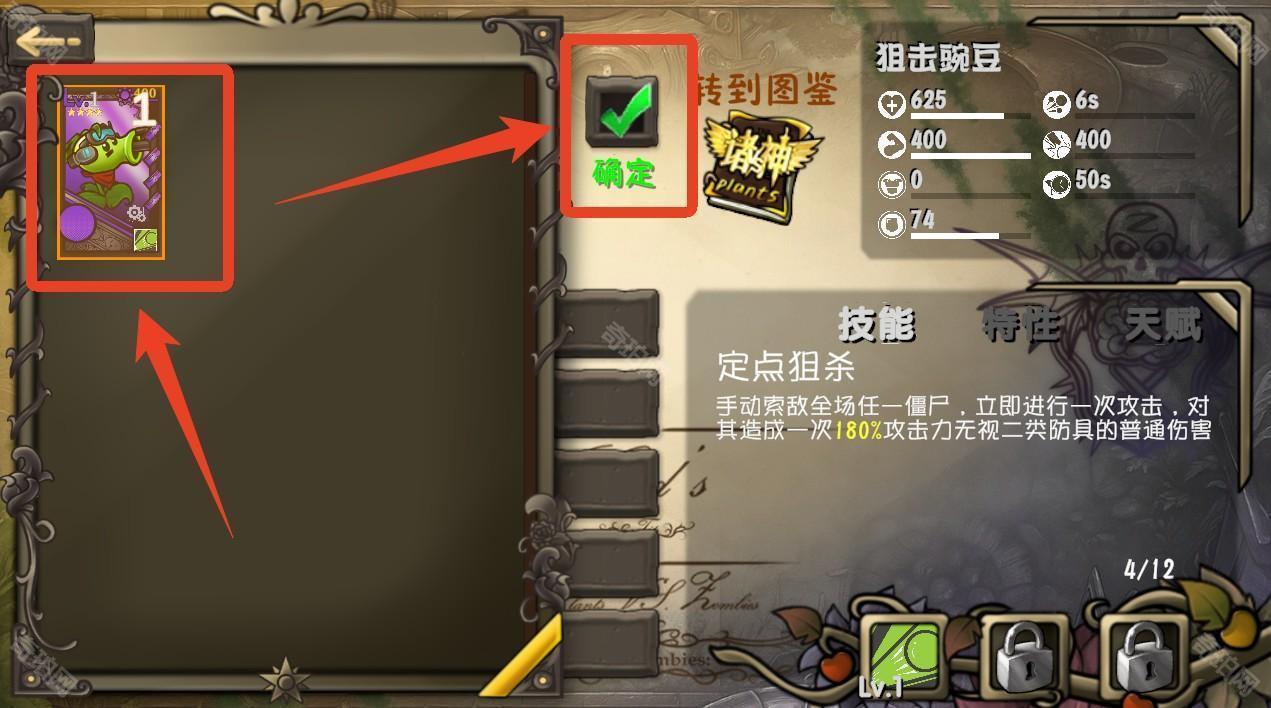 ②选定植物后点击右侧绿色【确定】键,此时可预览该植物的详细技能与属性。