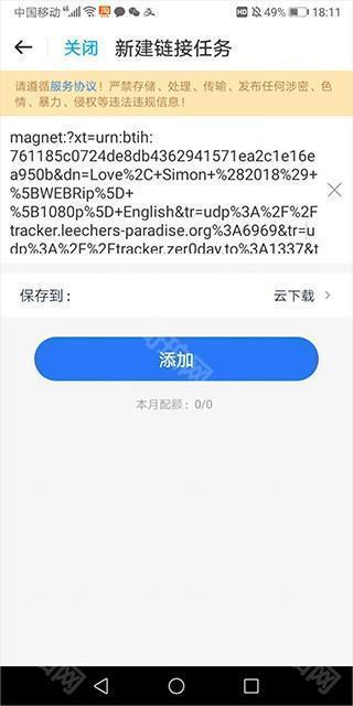 3、然后输入链接地址,支持直链下载和磁力(即bt文件链接下载新形式)、电驴链接(比bt更早的一种下载方式),例如下图中就是输入了一条磁力链接。