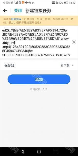 4、这里输入的是电驴链接,输入完成后选择保存位置,然后点击【添加】即可开启下载。