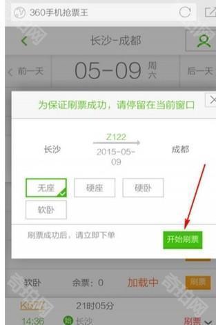 6、选择席别,点击【开始刷票】。