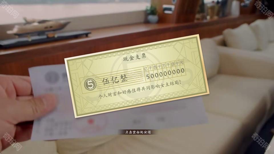 5、跟随剧情的进展,先进行人物对话,然后我们就可以得到一张五亿元的现金支票,我们可以屏幕任意空白处