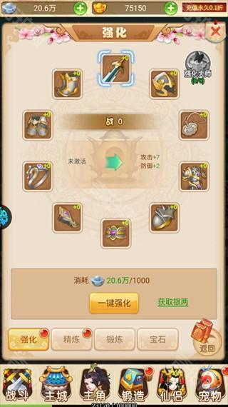优先强化武器和防具,利用“一键强化”功能快速提升属性,前期消耗的银两可通过关卡挑战轻松获取。