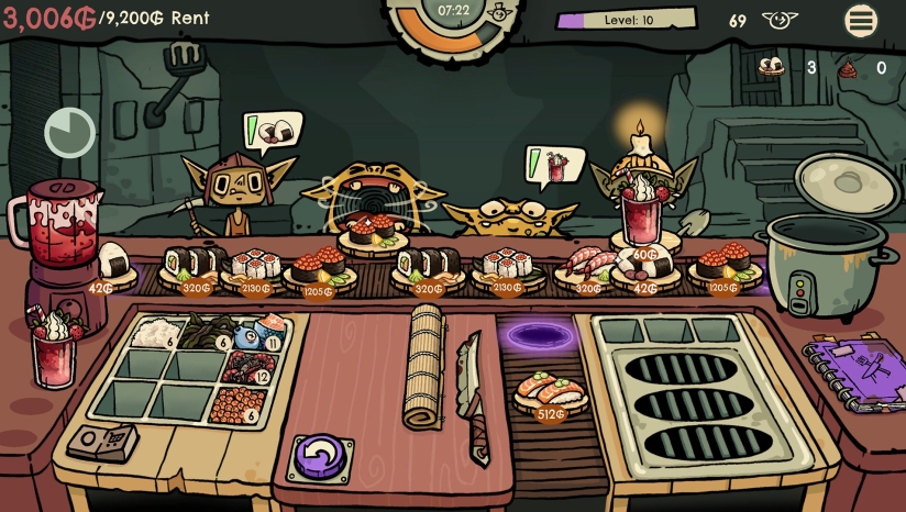 2、游戏将肉鸽元素融入餐厅管理模拟游戏中。你将扮演一个地精寿司厨师的角色,为地精同胞手工制作寿司。