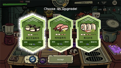 2、使用多种食材的组合制作寿司,并通过随机卡片解锁新的食材和寿司食谱,逐步扩大菜单。